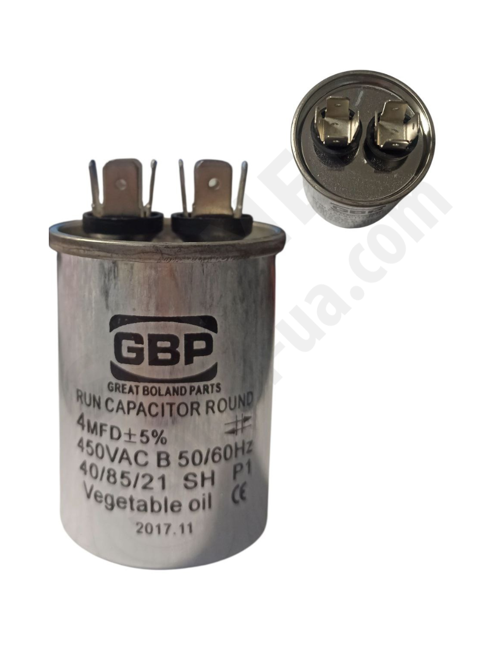 Герметичный металлический корпус с масляным наполнением защищает конденсатор от влаги, пыли и перегрева, обеспечивая надёжную работу при длительных нагрузках. Конденсатор рассчитан на непрерывную эксплуатацию при напряжении до 450 В и частоте 50/60 Гц.